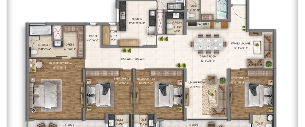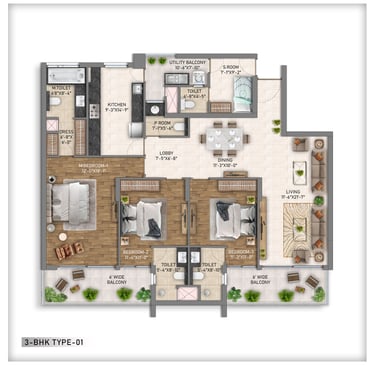 The residential offerings cater to diverse needs with spacious configurations: 2BHK apartments starting from 1,530 sq. ft. (introductory prices around ₹1.35 crore), 3BHK units from 1,800 sq. ft. (approx. ₹1.99 crore onwards), 4BHK layouts up to 3,500 sq. ft., and exclusive duplexes (2,800–4,200 sq. ft.) plus penthouses (3,345–6,895 sq. ft.). These high-rise towers feature contemporary interiors with premium finishes—imported marble flooring in living areas, HDF paneled doors, uPVC windows for energy efficiency, and high ceilings for an airy feel.